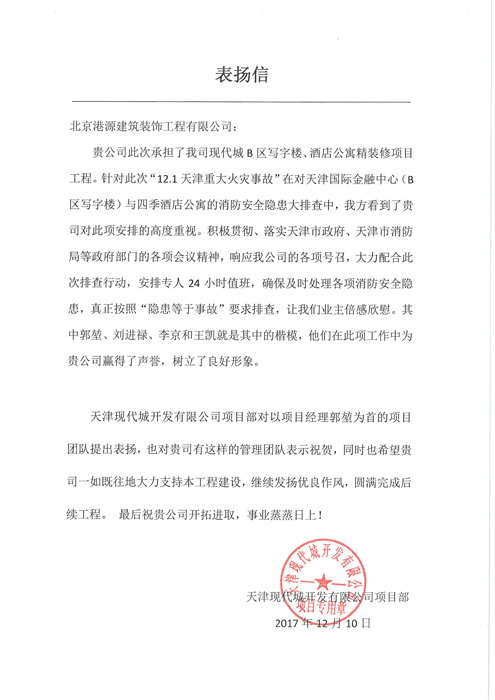 天津現代城項目表揚信
