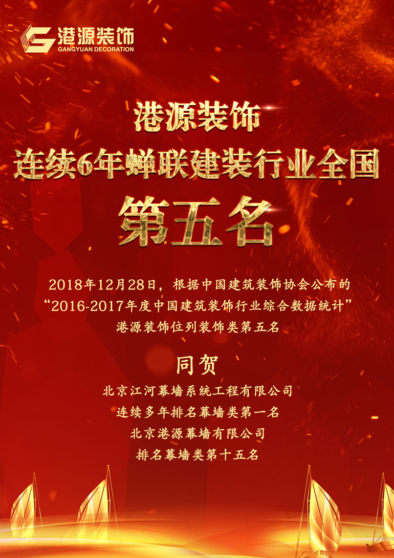 港源裝飾連續(xù)六年蟬聯(lián)建裝行業(yè)全國第五名
